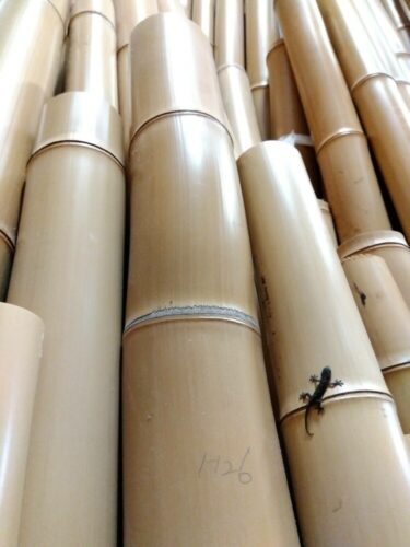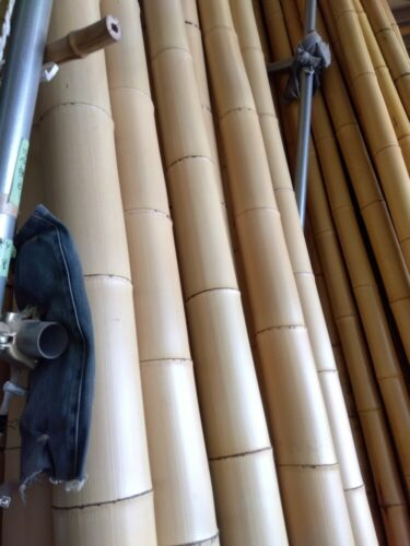 大原野の竹材店から納品された仕上がりたての白竹孟宗竹これぞ京銘竹京都の竹職人の汗と技術が眩しく光る「社長、今年の竹はここ数年の中でも最高の仕上がりですね」Rさんの声掛けに親方は静かに微笑み返してジーンズ枕をそっと入れた