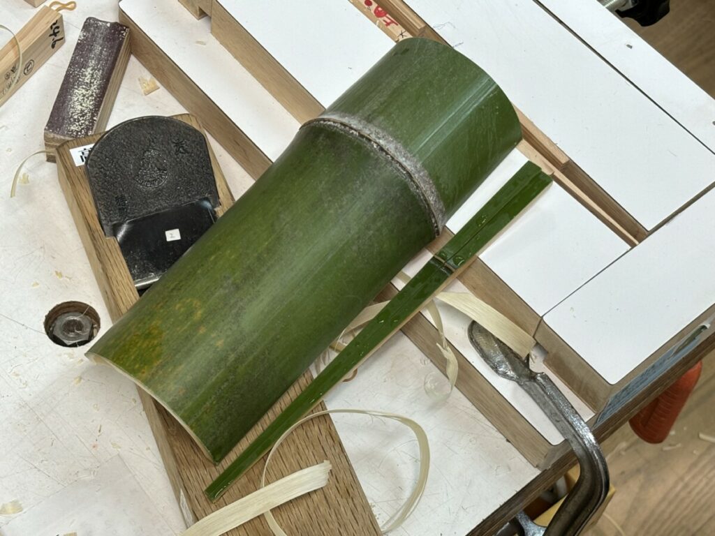 カンナ削り:治具に青竹をセットして裏・横とカンナで形に削る