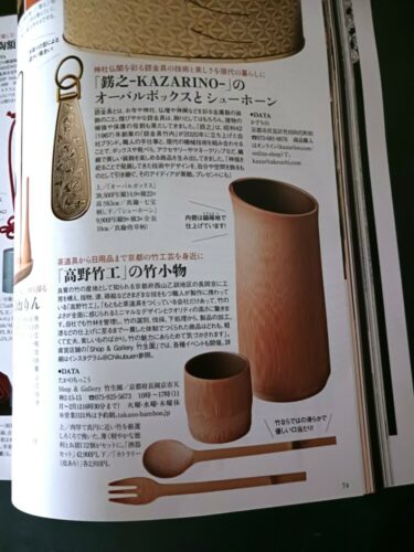 小学館の雑誌『和楽』にて、アートコンサルタントの片山由佳子さんによる特集「京都で買うならコレ!」で、高野竹工の錫蒔地の酒器セットなどが掲載されました。